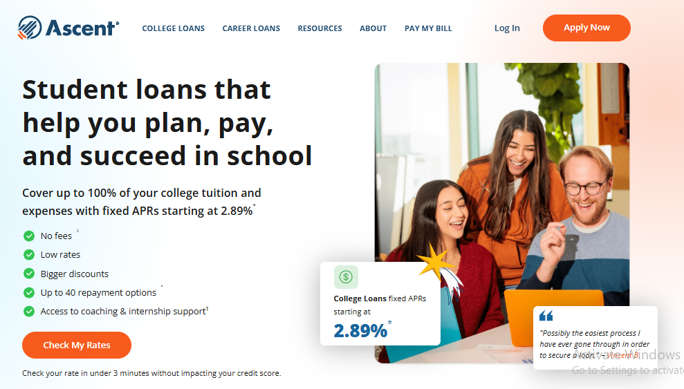 • The Lowdown: Ascent stands out by being one of the only lenders to offer a credible non-co-signed loan. Their “Outcomes-Based” loan for juniors, seniors, and graduate students considers your school, program, GPA, and cost of attendance instead of just your credit history.